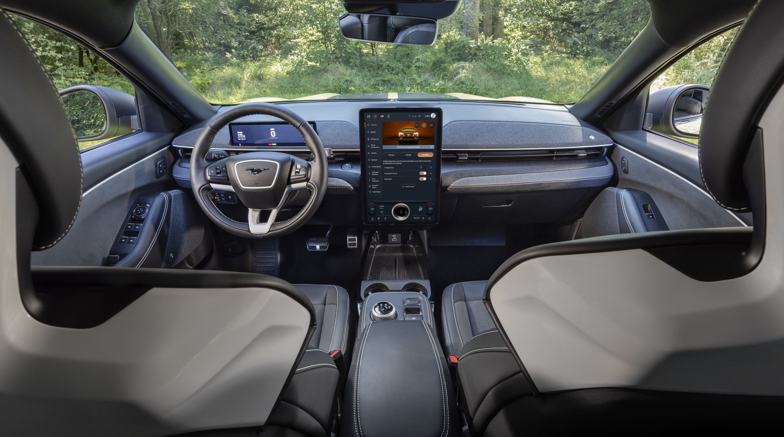 The raw power of the Mach-E Rally’s engine is only fully effective when complemented by the latest technologies, such as the first RallySport driving mode developed by Ford. Designed for off-road driving, it provides better control and handling in tight bends. Combined with new tires, this driving mode enables the Mach-E to perform better on snowy or slippery roads. Equipped with the latest BlueCruise hands-free driving technology, as well as several driver assistance features, the Mach-E helps you get around safely while maintaining the pleasure of driving.